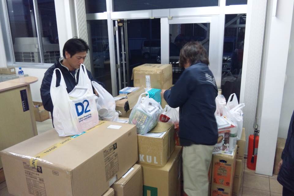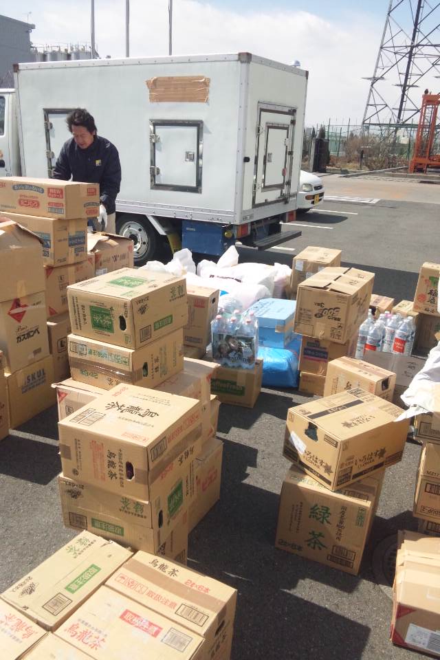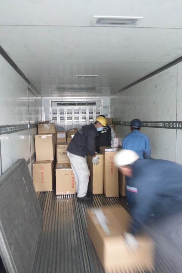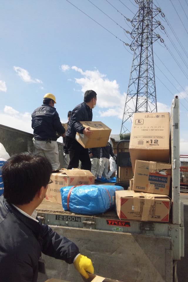社員の友達も一緒に参加してくれました。また、地元企業の有志も協力してくれました。また、中部、近畿、中国、四国、九州の多くの同業者も協力してくれ、合計トラック3台分の物資を送る事が出来ました。本当に協力して頂いたみなさん、ありがとうございました。