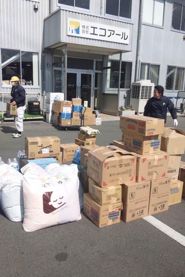エコアールも大変微力ですが、救援物資を困っている方々のためにと、かき集めさせて頂きました。社員のみんながあちこち出向き、ここ北関東でも物資が不足している中、何とか形にしてくれ、トラック一台分位用意する事が出来ました。また、ある女性社員からの提案で、義援金を募ったり、自宅にある品物で、救援物資になるであろう物資も送らせて頂きました。