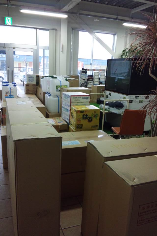救援物資を整理しているエコアールスタッフ(エコアール事務所ロビーにて)