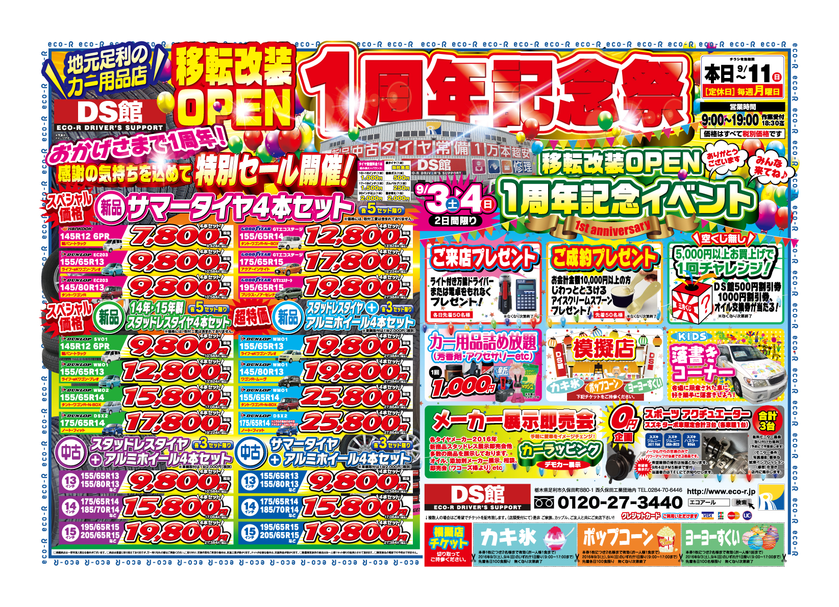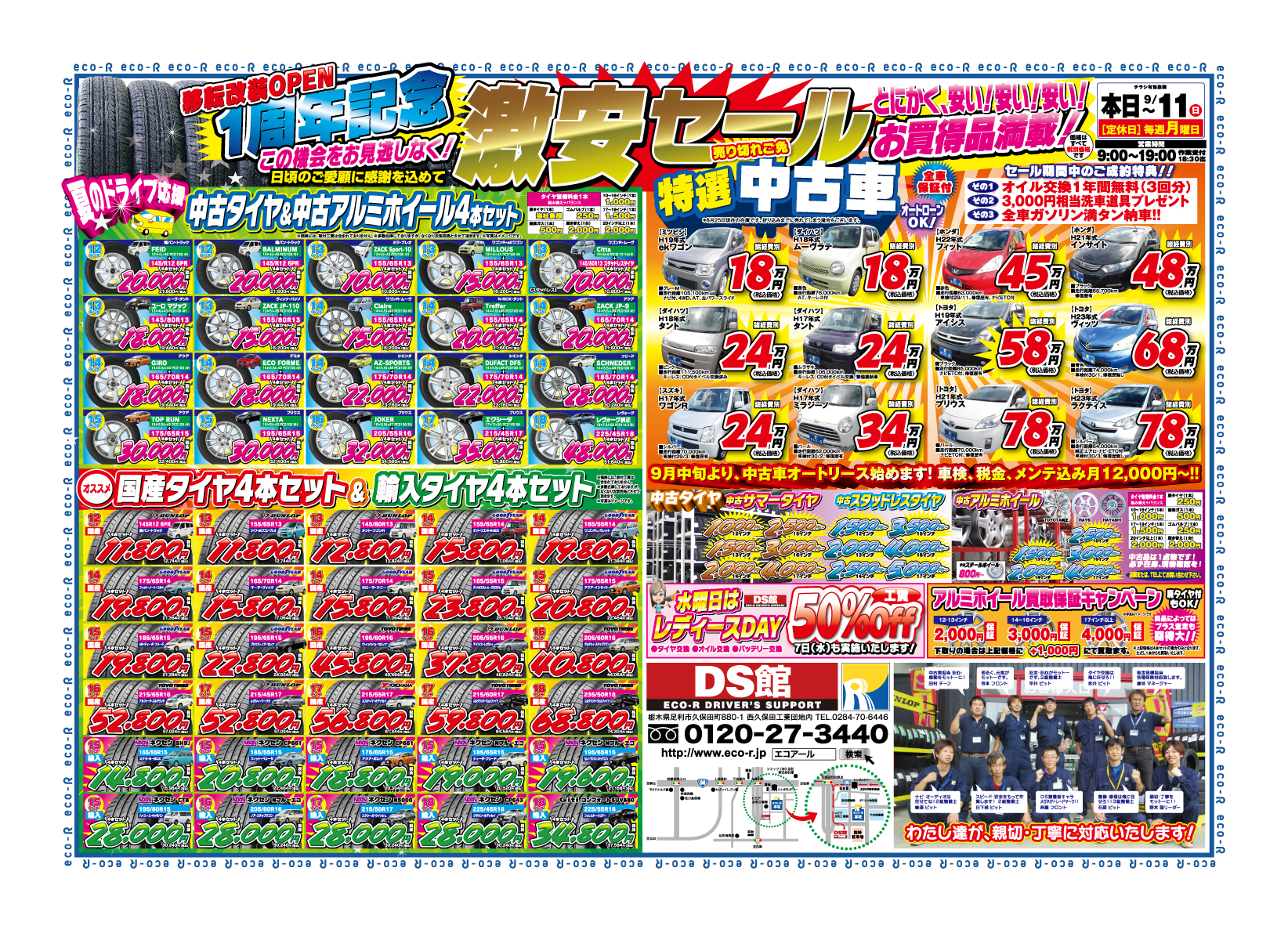 みなさんいかがお過ごしでしょうか? 朝晩は秋らしさを感じる今日この頃となりました。早いものでDS館も移転して1年経過する事が出来ました。日頃からお世話になってるみなさまに、感謝の気持ちを込めて記念セールを開催します。今後ともエコアールDS館をどうぞよろしくお願いします\(^o^)/